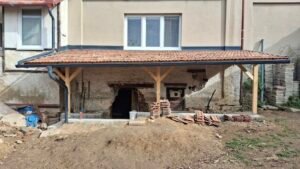 Na tuto konstrukci jsme navázali dřevěnou pergolu, navrženou jako přirozené architektonické prodloužení objektu. Nosná dřevěná konstrukce byla osazena na opěrnou zeď a zastřešení je elegantně opřeno o stěnu domu, čímž vzniklo funkční a zároveň vizuálně klidné řešení. Součástí realizace bylo také položení střešní krytiny, zajišťující ochranu vstupu před povětrnostními vlivy.