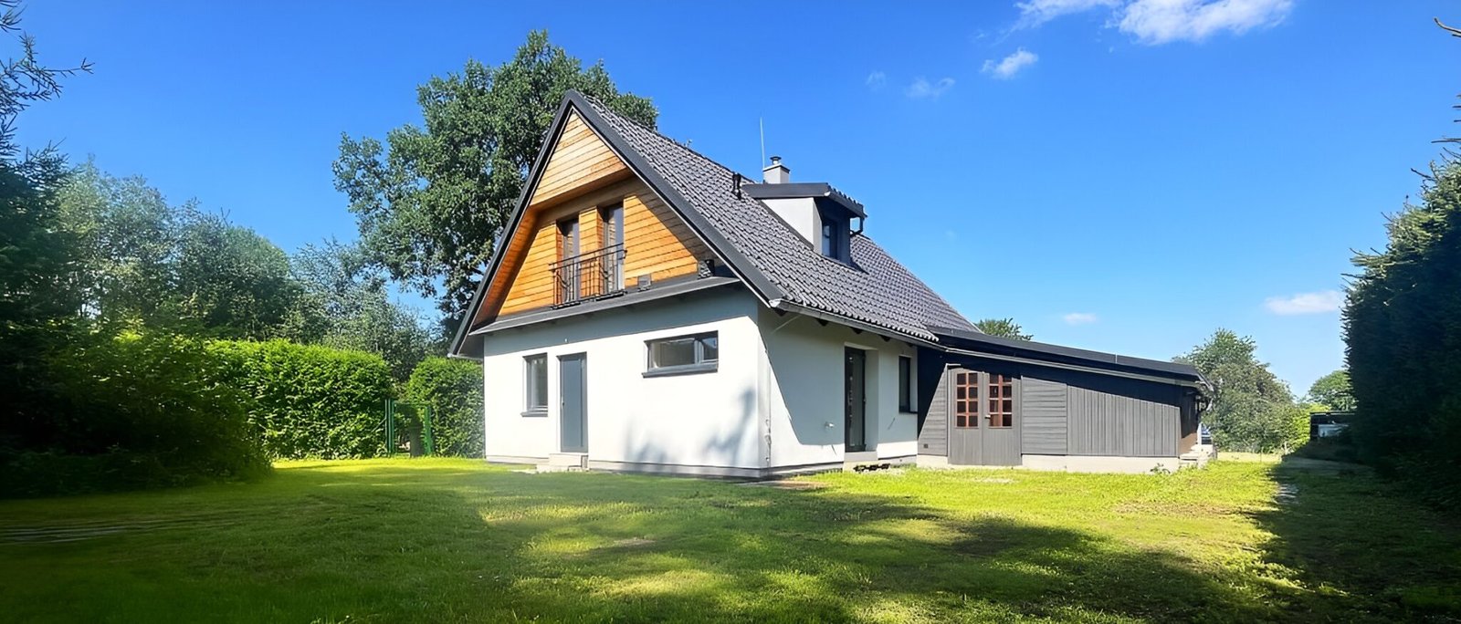 V malebné obci Nové Dvory na Vysočině jsme realizovali moderní dřevostavbu, která spojuje kvalitní stavební provedení, moderní technologie a klid venkovského prostředí. Tento rodinný dům nabízí pohodlné a úsporné bydlení v prostředí, kde se technická kvalita potkává s přirozenou estetikou.