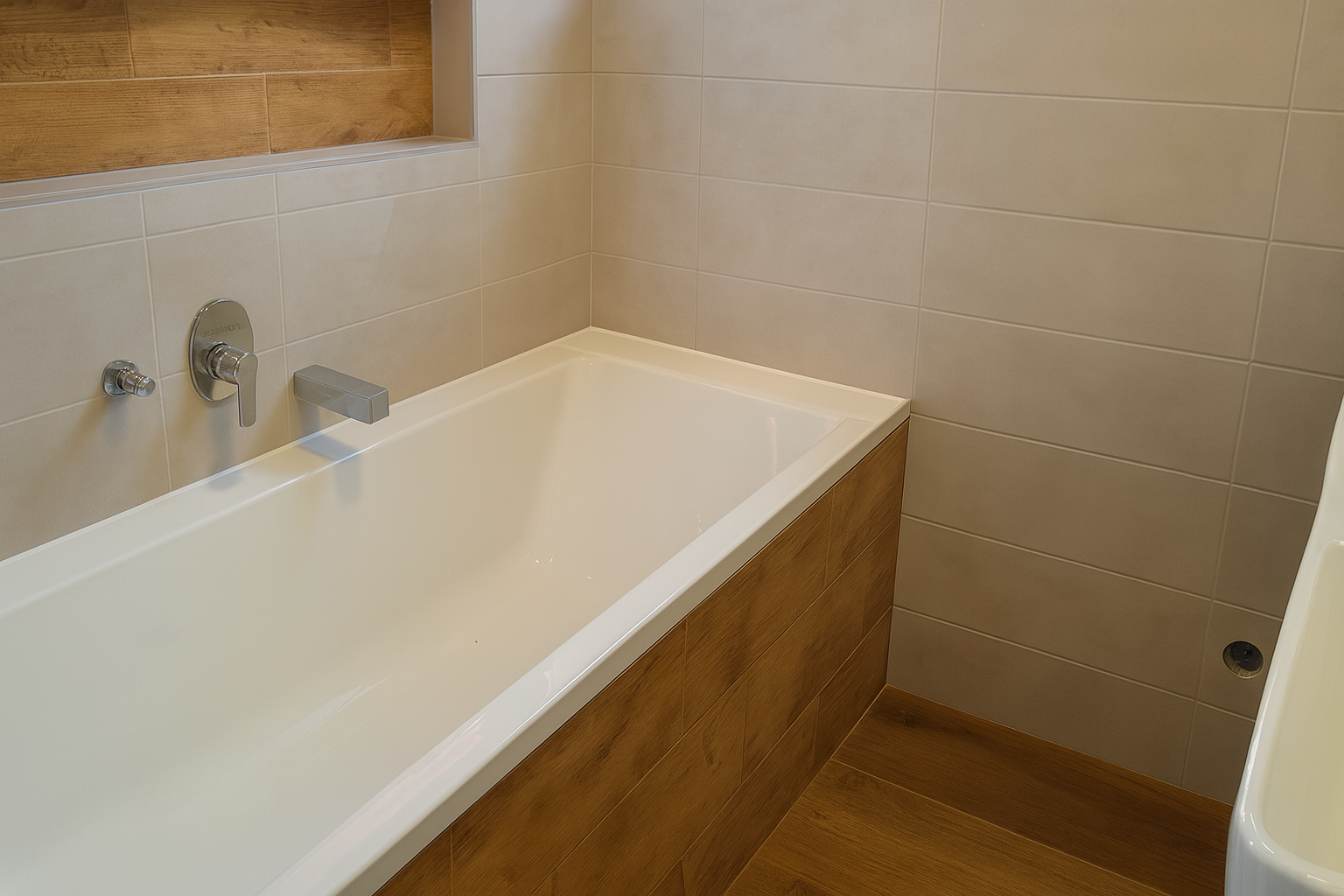 V Přibyslavicích u Velké Bíteše jsme realizovali moderní rekonstrukci koupelny s důrazem na design a funkčnost. Součástí prací bylo vytvoření praktické niky nad vanou, vybavené mnohobarevným LED páskem, který dokáže navodit příjemnou atmosféru při večerním relaxu. Stěny a podlahu jsme obložili velkoformátovými obklady v kombinaci teplých dřevodekorů a neutrálních tónů, což prostoru dodalo moderní a útulný vzhled. Instalovali jsme kvalitní vanu a špičkové podomítkové baterie, které podtrhují čistý a elegantní vzhled celé koupelny a zajišťují dlouhou životnost i bezproblémové používání.