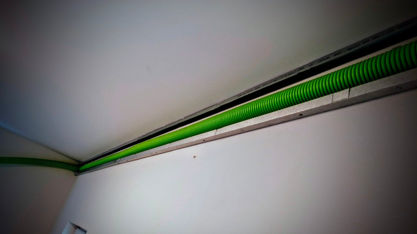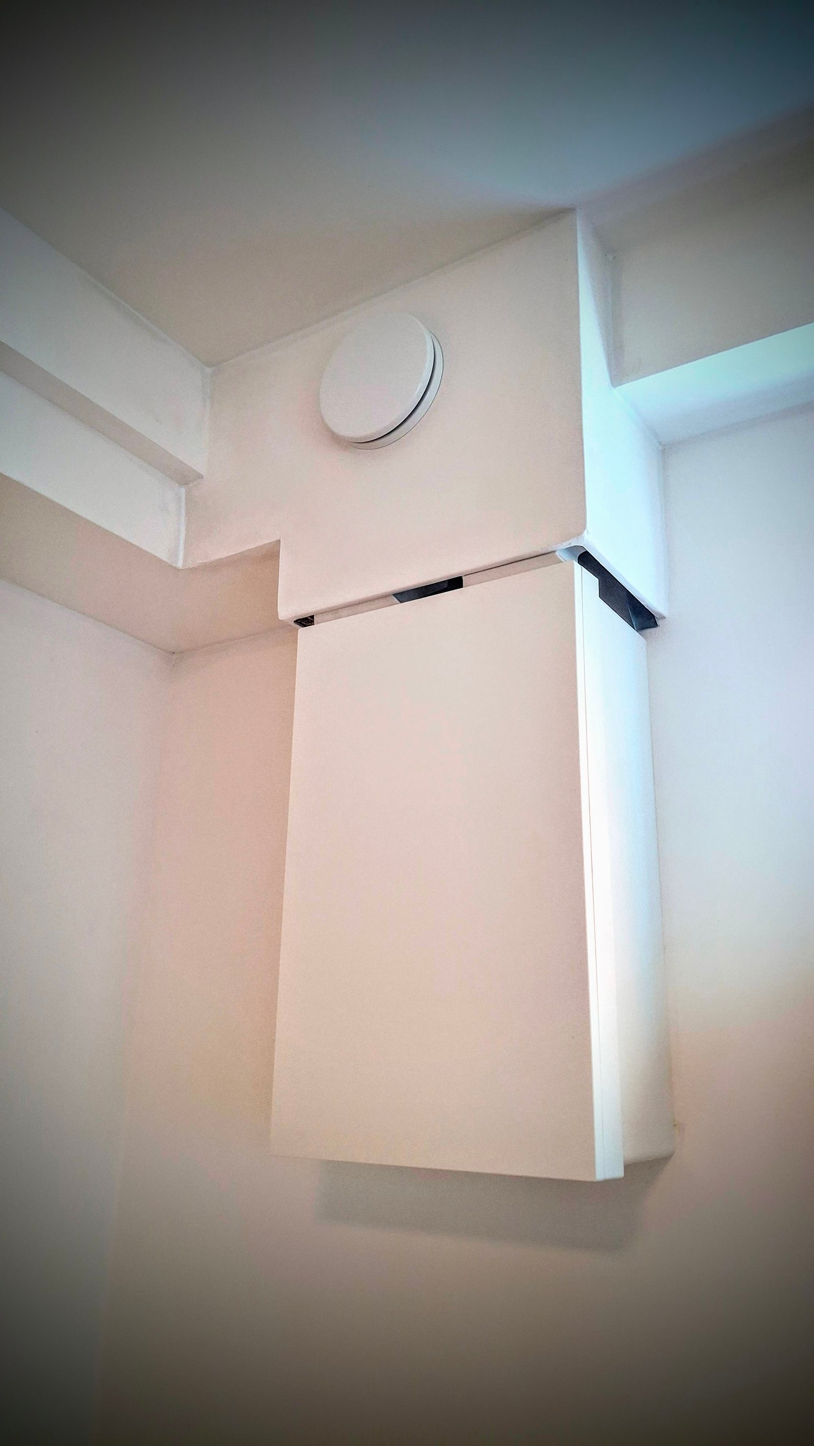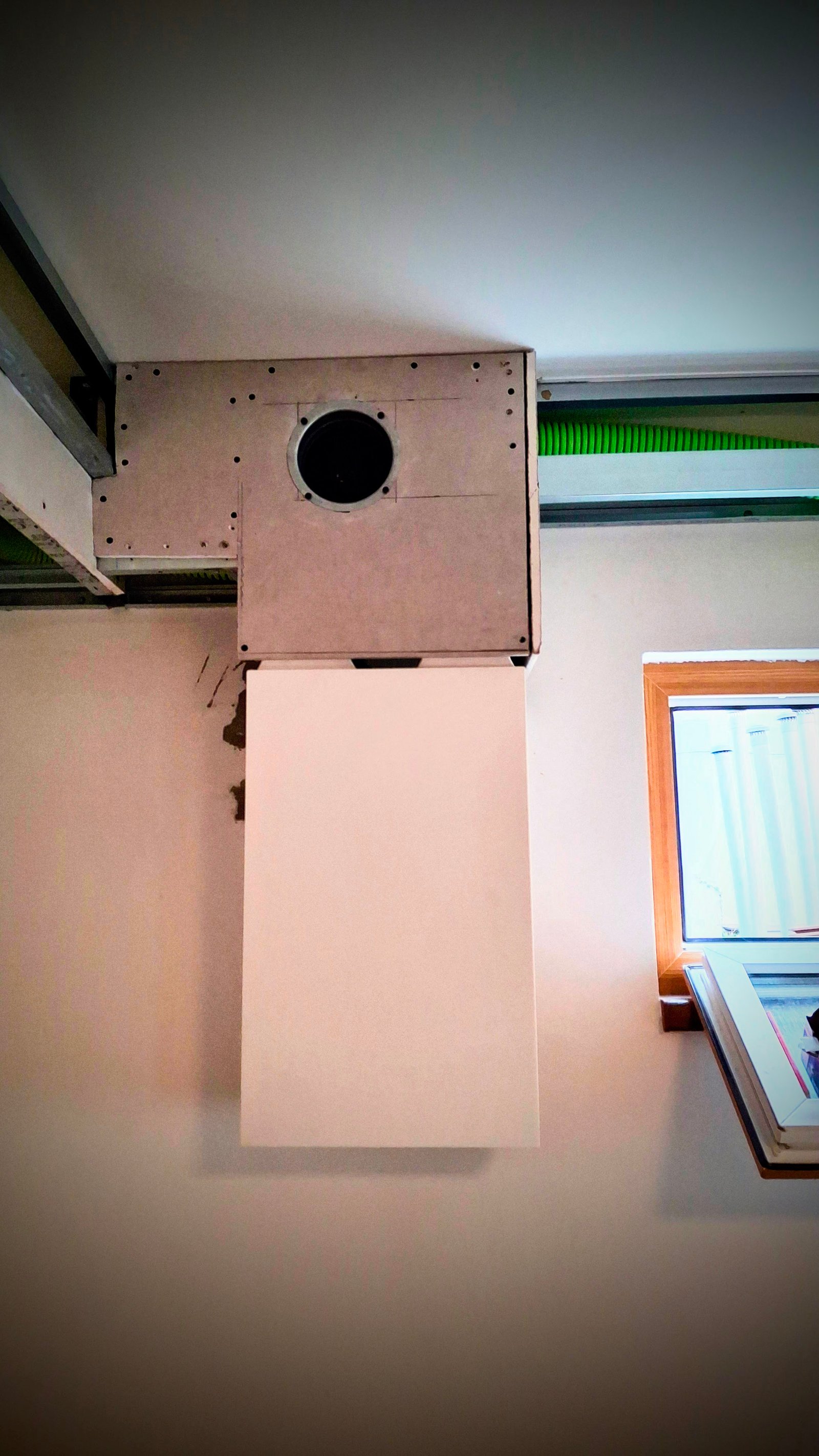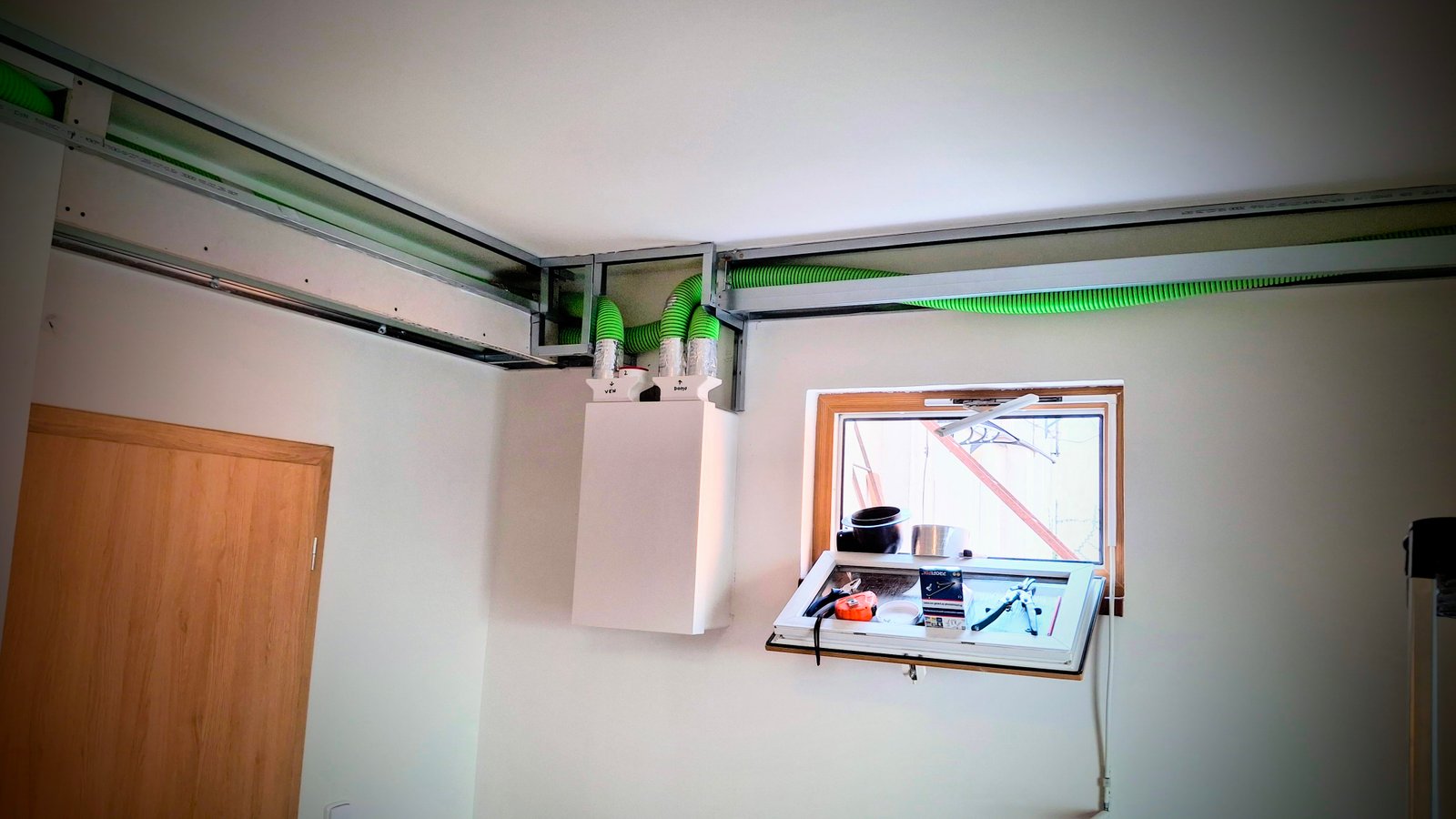 Potrubí bylo vedeno ve stěnových drážkách a zakryto SDK krytem pod stropem. Na vyústěních byly instalovány kovové regulační ventily (anemostaty) pro nastavení přívodu a odvodu vzduchu.